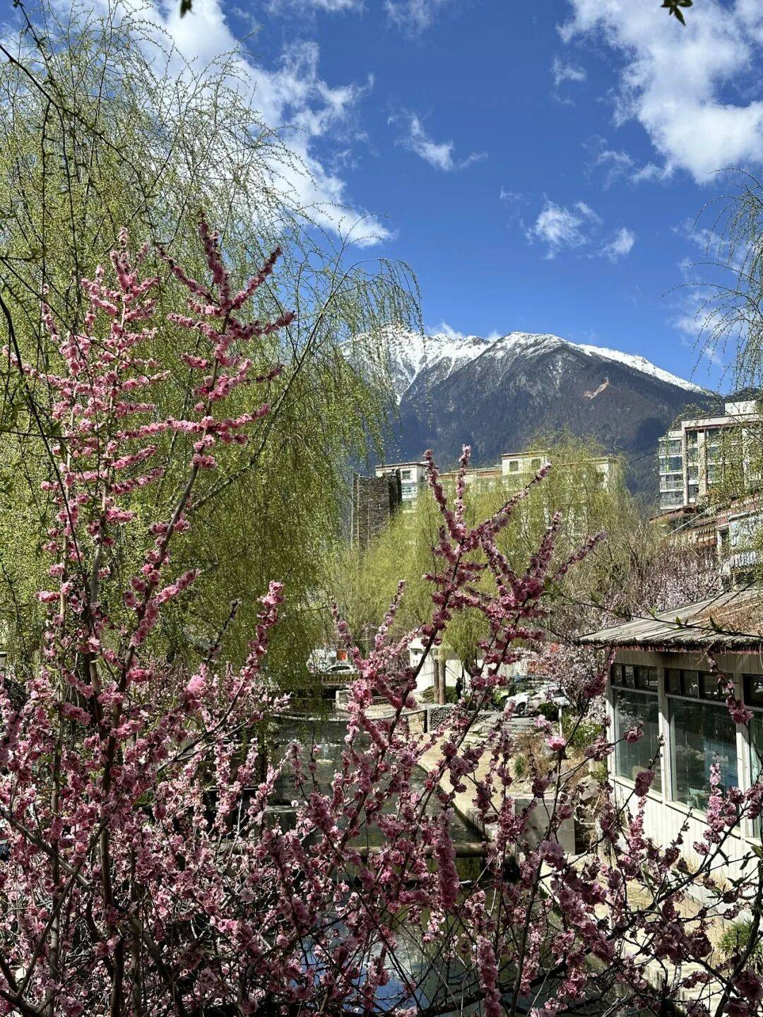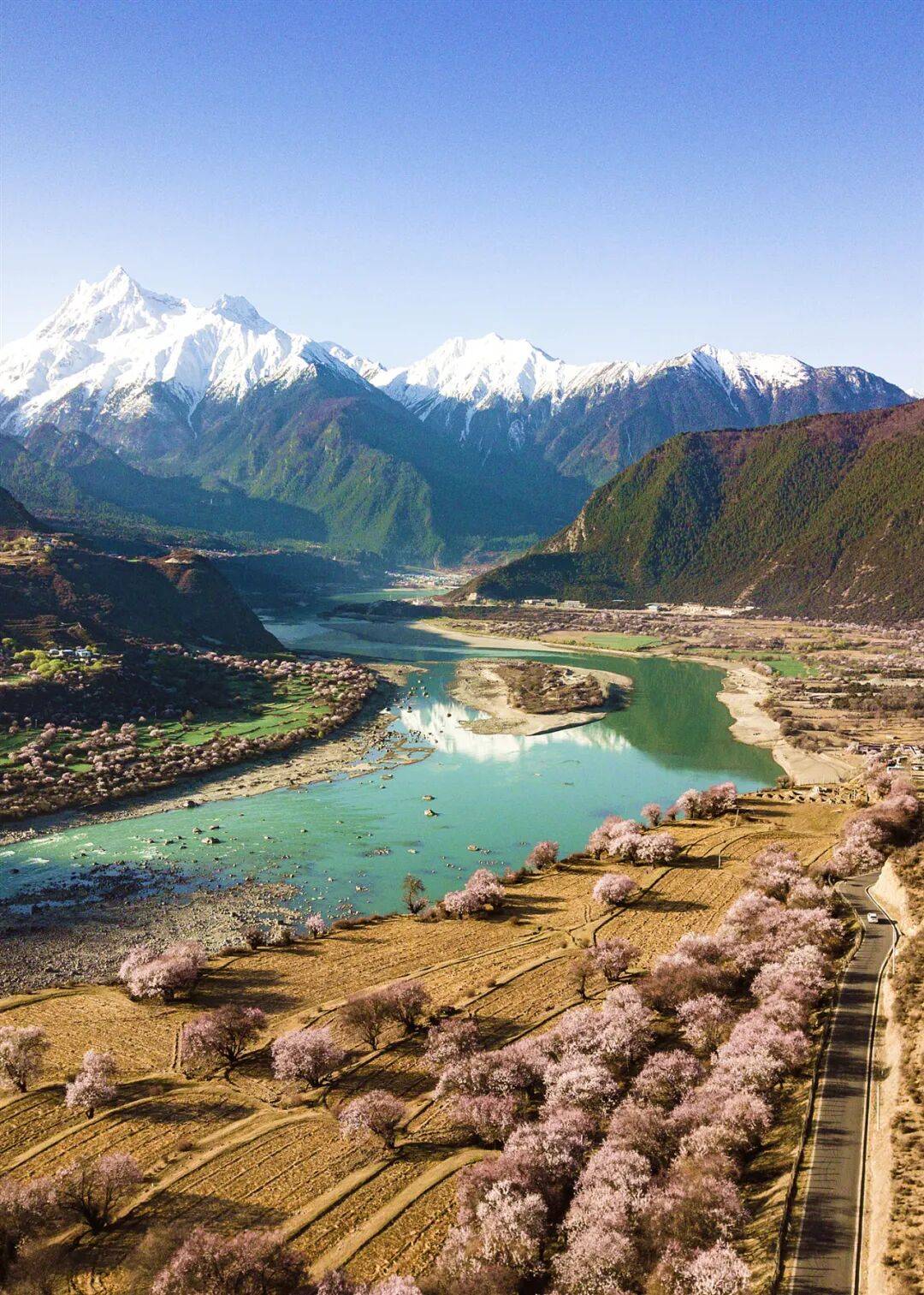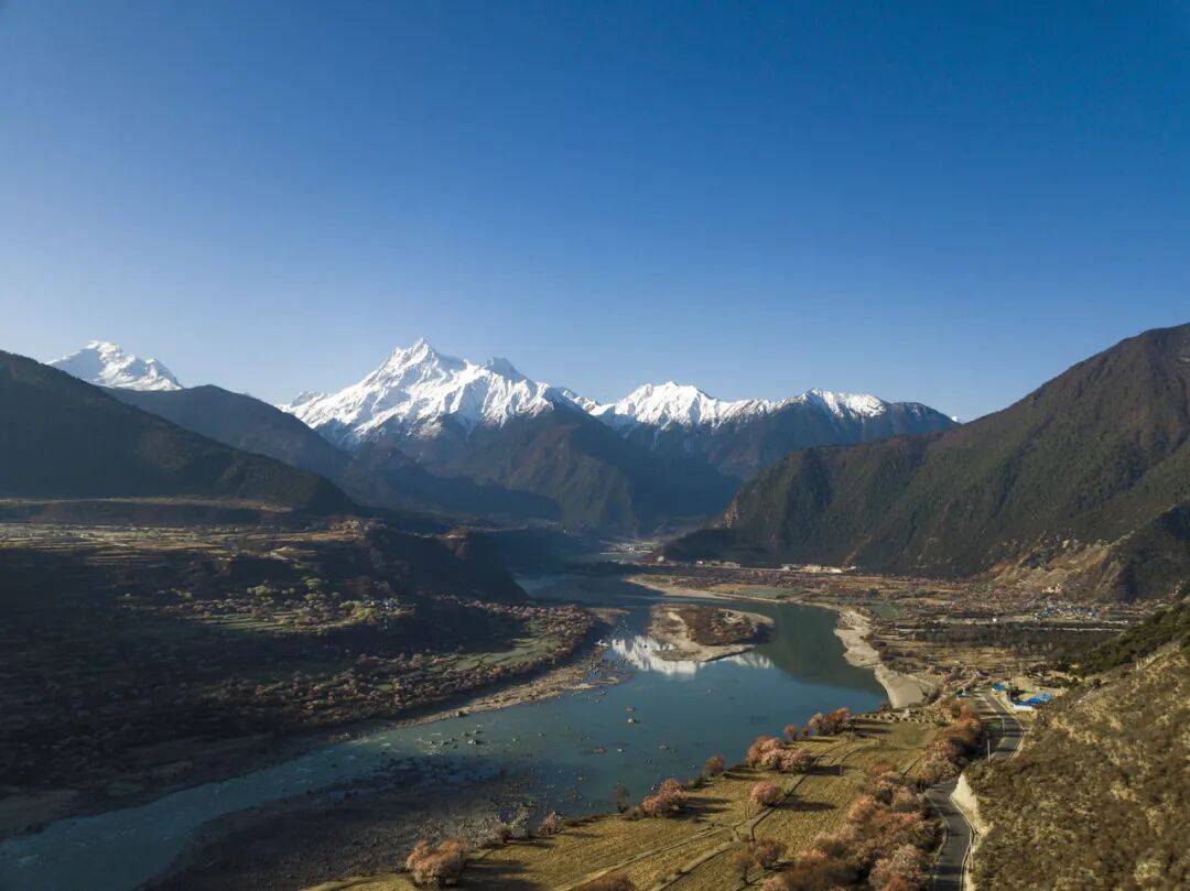 大师从全国各地前去林芝,雪域桃花,烂漫至极,远处青山,索松村正处于雅鲁藏布大峡谷、南迦巴瓦峰对面的半山腰上。